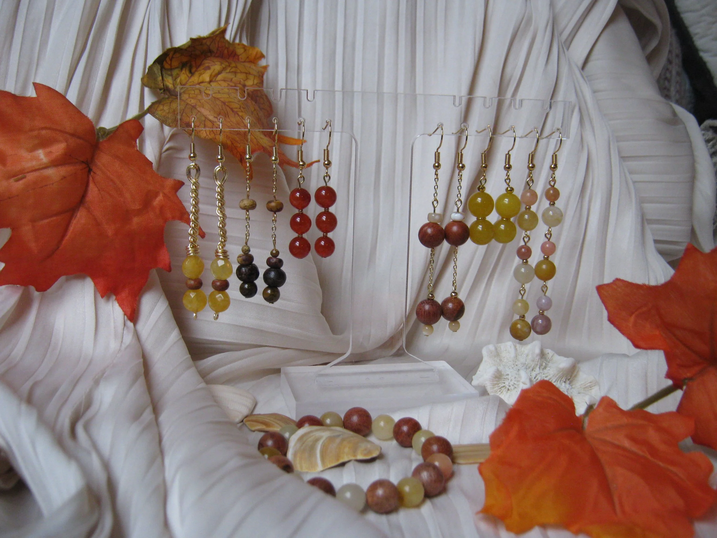 Comprised of natural stones, pearls, shells, and other ceramic beads. Wrapped with gold plated or silver plated wiring to complete the perfect set. All earrings and seamless bracelets are Nickel Free! Shop cautiously though, as not all of my pieces are non-hypoallergenic (free from allergens). I am currently working on a solution!